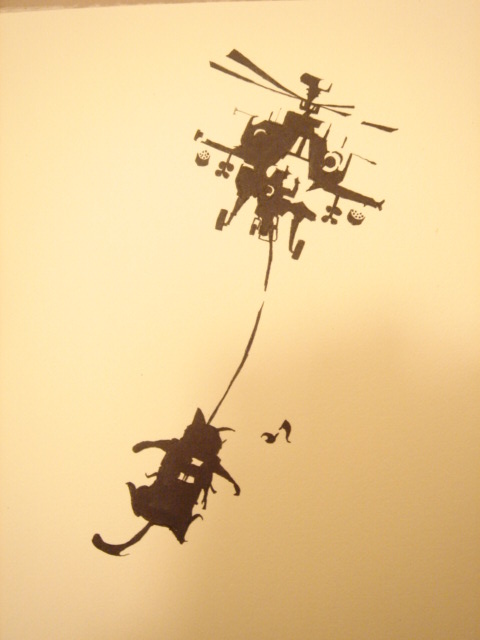 今日は模写ではなくて自分で考えて描いた。でも、黒と白の描き方を勉強したい&その好みがBanksy、そして一枚で言えるような絵という窮屈さがあるので、まだまだオリジナリティに欠けるけど、まいいや。AH64に釣られて、パラシュートをもってこれから飛びに行く猫。