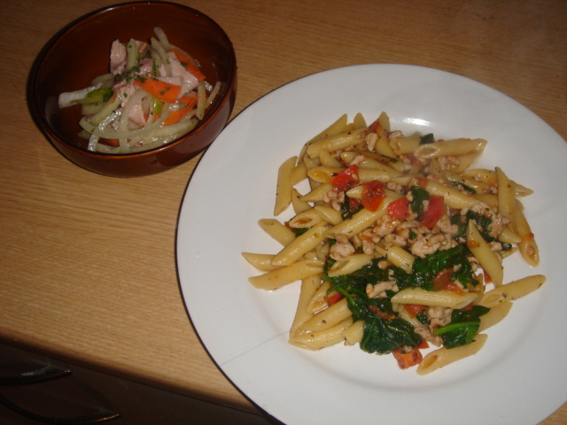 夜は、玉ねぎ・にんじん・セロリのマリネと、ほうれん草のパスタを作った。