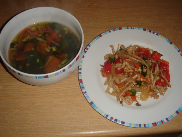 すいとん!…見えてないけど。小麦粉がとにかく大量に余っているので、今のうちに使う。にんじんとほうれん草を入れて、しょうゆ、みりん、だしのスープで煮た。小麦粉って美味しい。あとは、春雨入りピリ辛野菜炒め。