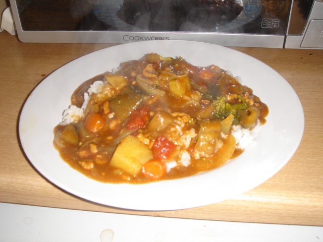 玉ねぎが多く入れすぎて玉ねぎカレーになると思ったら、そうでもなかった。ブロッコリーやナスで、色も。おいしかった。最近お米を食べていなかったので、久しぶり。