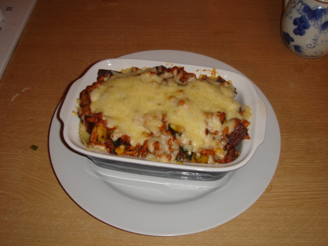 耐熱容器の下にゆでたパスタを敷いて、上に、マッシュルーム、ナス、ズッキーニ、玉ねぎ、ひき肉をトマトピューレで炒めたものを乗せて、チーズをかけてオーブンで焼く。バジルとハーブとパセリをたくさん入れたらとてもいい味になった。久しぶりにオーブンを使った。楽しかった。