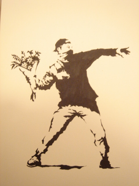 これは、模写。BANKSYというグラフィティ(graffiti。壁の落書きなどのこと)・アーティストの作品の一つを、真似して描いてみた。一つ描いてみただけで、すごい勉強になった。この人の作品は世相の風刺や戦争反対などのメッセージが込められていることが多いけれど、一瞬(一枚)の絵で伝えたいことが解る。すごいことだと思う。作品の中には、おいおい、えぇ…というパロディももちろんたくさんある。この絵は、動作や風貌からして、一見、火炎瓶でも投げてしまいそうな雰囲気だけれど、手に持っているのは花束。いいですねー。