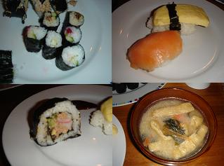 カリフォルニア・ロール(左下)を作ってみた。意味はないけれど、とりあえず『アボカド』を克服すべく、一番食べても気にならないだろう方法が、お寿司の気がしたので、挑戦。生まれて初めてアボカドを自分の手で買い、初めて切ってみた。おぉ…あまりのやわらかさに眩暈が(嘘)。カニと、マヨネーズで和えたツナと、アボカドを入れて巻く。本当は外側はゴマをつけたご飯の面なのだけれど、うまく切れなかったので、のりを巻いた。味は、良かった。アボカドって、料理に入ったときの存在感が、見た目よりずっと薄い気がする。