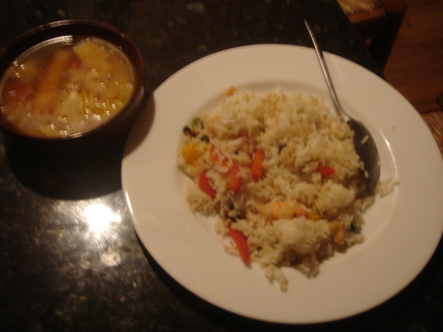 シーフードの炒飯(またサフランを忘れた…のでパエリアと言えず)と、トマトとソーセージと白菜の煮混みスープ。デザートにりんごを食べた。