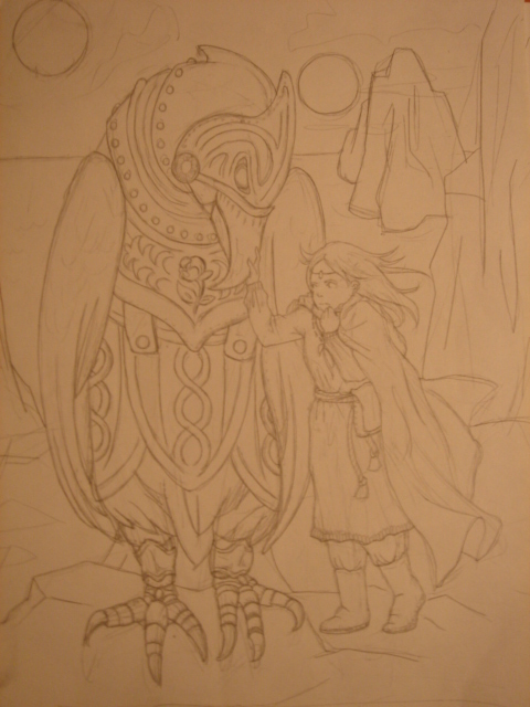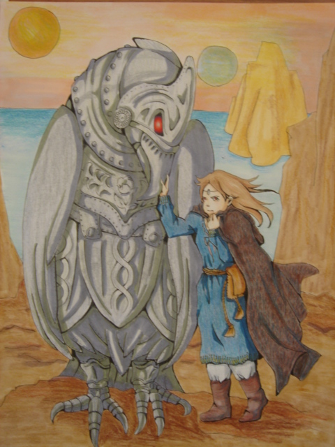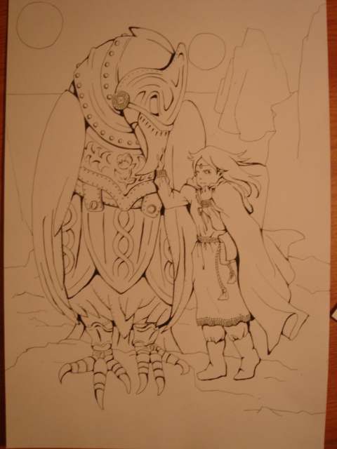 これは下書き。何が描きたいのかよくわからないけれど、楽しいのでよし…。頭の中で勝手にファンタジィ系の話を作って、その一場面。『鳥は、鉄でできた鳥で、彼女は王国を抜け出してきた皇女です。彼女は旅の途中、その変な鉄の鳥に出会います。それは人工的なものでしたが知能を持っていました。彼女はその鉄の鳥と友達になりますが、どうやらその鳥はどこかの国の軍備の一つのようで、明らかな戦闘道具だったのです。彼女はその秘密を探るべく、その国を探し回りますが、同時期、自分の国が危機に陥っていることも風のうわさで耳にしました。この鳥は、軍事施設を用意しているその国の本当の目的とは、果たして皇女は…。』みたいな感じ。