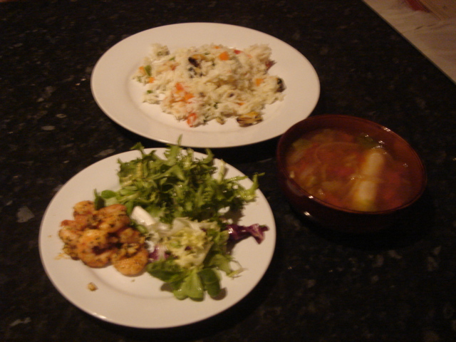 パエリアが作りたかったけれど、サフランを買わなかったので仕方なく白い米のまま。玉ねぎ、3色のピーマン、人参、マッシュルーム、4種類くらいのシーフードを入れたバスマティのパエリア。あとは、サラダに、海老をにんにくとパセリ、ケチャップで炒めた。あとは、トマトとソーセージ、玉ねぎ、レタスのスープ。今日はどれも西洋系。上手に作れた。シーフードっていいかも。どれも余ったので、また明日。