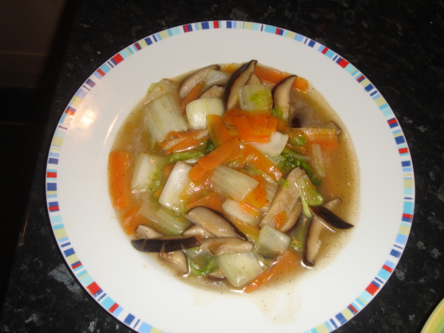 レタスと卵のピリ辛スープ。 椎茸、白菜、ニンジンのあんかけ炒め。