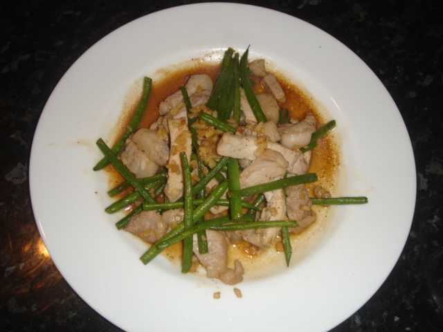 インゲンと豚肉のニンニク醤油炒め。 中華風ハンバーグ。ソースの味付けは主に塩と酢。