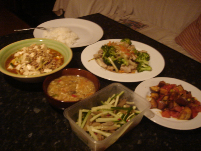 おなじみ、酸辣湯と麻婆豆腐。あとは、茄子とトマトのサワーソース炒め、豚肉の野菜炒め、ザーサイときゅうりのピリ辛サラダ。作りすぎたけれど、どれも美味しくできた。