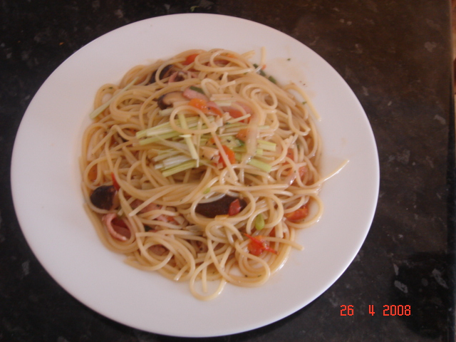 妹の家でも一度作ったけれど、玉ねぎ、ベーコン、しいたけ、トマト、ネギのパスタ。名前なし。あさりも入れたら良かったかも。