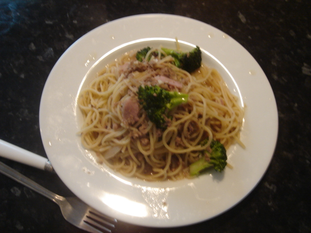 今回は、ブロッコリー、ツナ、玉ねぎ、ベーコンのパスタ。美味しかった。
