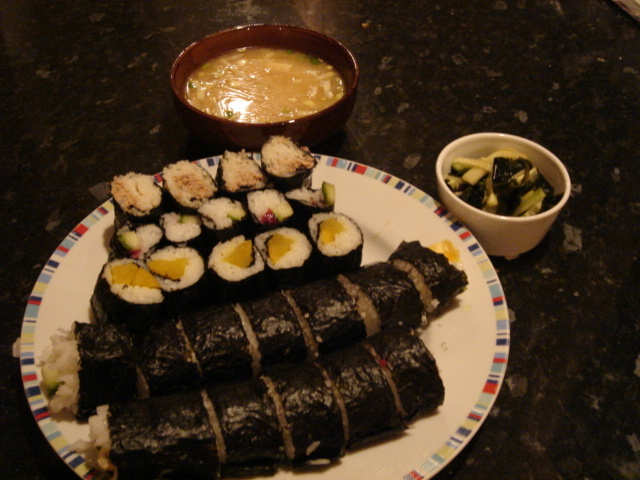 太巻きと、ツナ、きゅうり&梅、たくあんの細巻きと、お味噌汁に酢の物。酢ばっかりだ。