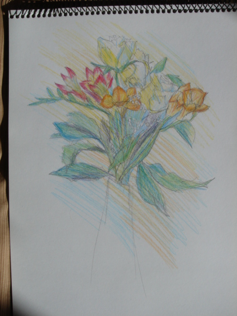 午前中はずっと絵を描く。以前買って飾っておいた花がもうすぐしおれてしまいそうだったので、今日描くことに決定。まずは鉛筆と色鉛筆で(別の紙に)下書き。