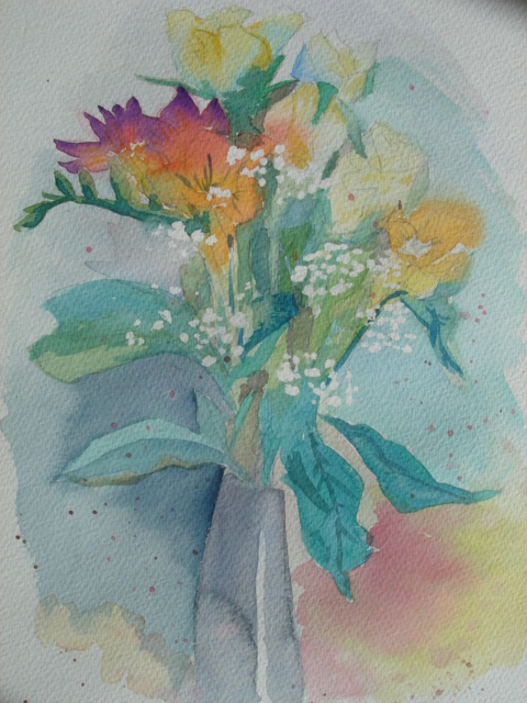 一種類は、白いバラだった。あとは知らない。すみれ草(でいいのかな)の白い部分は、マスキング・リキッド(和名知らず。液体で、乾くとゴムのようになる)を使ってすべての色を塗った後はがした。そうすると紙のきれいな白地が残るのでとても面白い。やっと、出したい色や描きたい雰囲気を作れるくらいの技術の意味が解ってきた。その技術が身についたという意味ではなくて、そういう技術があるということを知ることができた、ということ。知ることによって、知らなかったということに気づく。