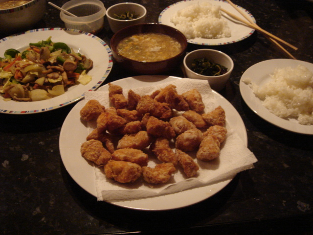 から揚げと、野菜ときのこの炒め物、コーンと白菜の卵入りスープ、わかめその他海藻の酢の物。から揚げは、ネギとしょうがと醤油と酢、ごま油少々のたれをつけるので、下味はほとんどつけなかった。栄養的にたぶんバランスは取れてると思う。フラットメイトと一緒に食べた。食べ過ぎた。
