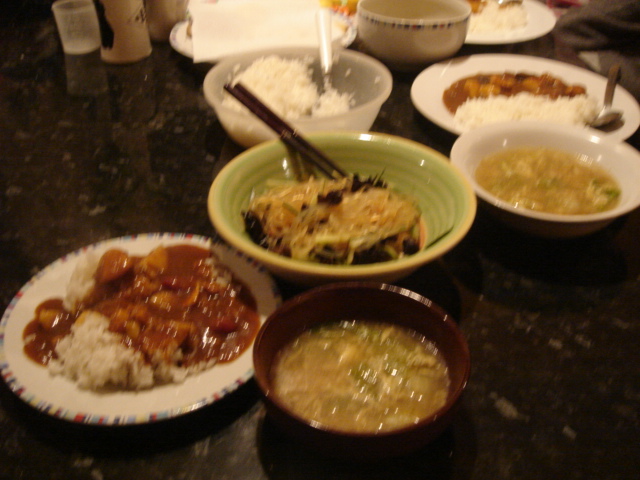 姉と友人と3人で夕食を。チキンカレー、レタスの卵のスープ、春雨・キクラゲ・チリ・きゅうりのサラダ。けっこうおいしかった。お代わりもしてくれたので、嬉しい。