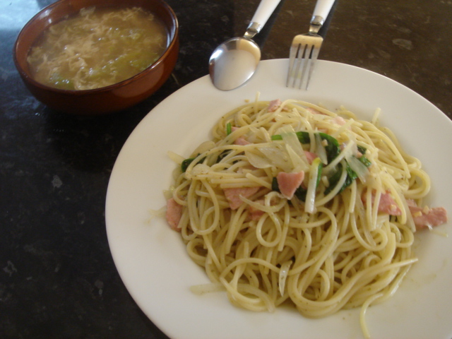 午前中は、部屋の掃除と洗濯など。いつの間にかお昼になったので、パスタを作って食べる。一番よく作る、ほうれん草とベーコン、玉ねぎのパスタ。
