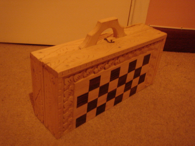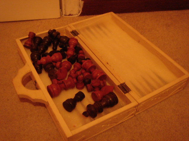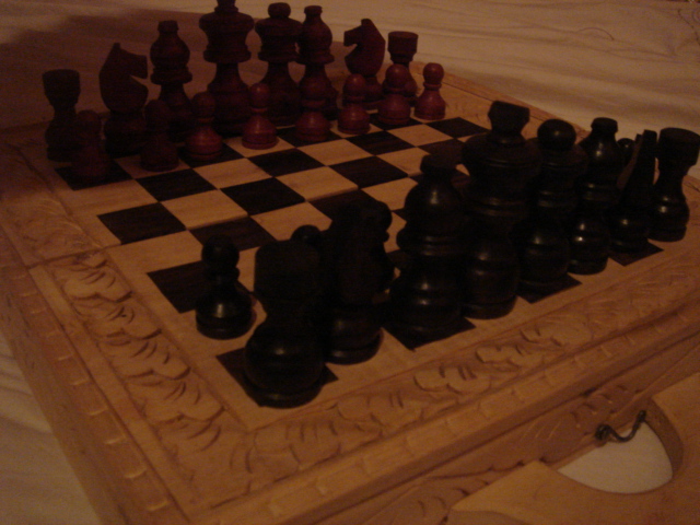 このチェス・セットは、2007年にフランスのエヴィアンに行った時、19ユーロで買ったハンドメイドのもの。一マスの大きさの割りに駒がとても大きくて(ファットと呼んでいる)、シンプルな動きしかしていなくても、ものすごく混雑して見えるという錯覚を引き起こす。また、クイーンが大きすぎて、隠れているポーンが見えない時も。