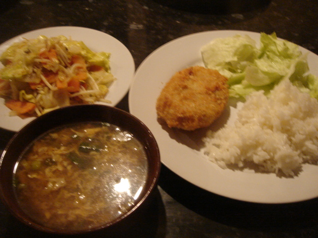 夜は、初めてのコロッケに挑戦してみた。ネットで調べたので簡単。じゃがいもを粉吹き芋にする手順で、火の上で鍋を「上下に振って」と書いてあった。「奥と手前」のことなんだろうな、と思いつつ、芋完成。あとは炒めたたまねぎ、ニンジン、ひき肉を混ぜて形を作り、衣をつけて、揚げた。あとは、青梗菜(に似た、Pak Choiと呼ばれる野菜)と卵の酢入りスープ、もやしの野菜炒め。コロッケは結構時間のかかるものだと解った。